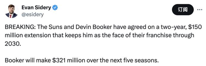 据记者Evan Sidery报道,太阳已经与布克达成提前续约协议,双方将签订一份2年1.5亿美元合同,这将确保布克未来5年,即在2030年以前仍然是太阳的门面球员,他在未来5年的总薪资突破3.2亿美元大关。